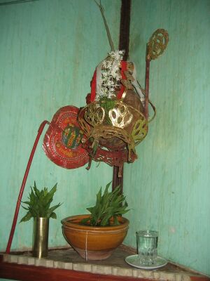The Bamar also profess a belief in guardian nats, particularly the veneration of Mahagiri, the household guardian nat.[44] Bamar households traditionally maintain a shrine, which holds a long-stemmed coconut called on-daw (အုန်းတော်), symbolic of Mahagiri.[44] The shrine is traditionally placed at the home's main southwest pillar (called yotaing or ရိုးတိုင်). The expression of Burmese folk religion is very localised; the Bamar in Upper Myanmar and urban areas tend to propitiate the Thirty-Seven Min, a pantheon of nats who are intimately linked to the pre-colonial royal court.[44] Meanwhile, the Bamar in Lower Myanmar tend to propitiate other local or guardian nats like Bago Medaw and U Shin Gyi.[44] Spirit houses called nat ein (နတ်အိမ်) or nat sin (နတ်စင်) are commonly found in Bamar areas.