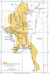 In the 1500s, with the expansion of the Toungoo Empire, the Bamar began populating the lower stretches of the Irrawaddy River valley, including Taungoo and Prome (now Pyay), helping to disseminate the Burmese language and Bamar social customs.[35] This influx of migration to historically Mon-speaking regions coincided with the rise of King Tabinshwehti.[44] This pattern of migration intensified during the Konbaung dynasty, particularly among men specialised in wet rice cultivation, as women and children were generally prohibited from emigrating.[44] Following the British annexation of Lower Burma in 1852, millions of Bamar from the Anya region resettled in the sparsely populated Irrawaddy delta between 1858 and 1941.[45][27] The Bamar were drawn to this 'rice frontier' by the British colonial authorities, who were eager to scale rice cultivation in the colony, and attract skilled Bamar farmers.[27] By the 1890s, the British had established another centre of power and political economy in the Irrawaddy delta.[45]