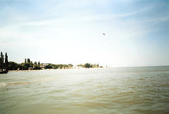 Because of the shallow waters, the development of aquatic life in the Sea of Azov is more characteristic of a lagoon, and the plankton patterns are rather similar in the open sea and near the shores. Despite its shallowness, the water has low transparency, so bottom plants are poorly developed and most algae are of planktonic type. The sea is characterised by high concentrations of organic matter and long blooming periods. Another specific feature of the sea is the variable salinity – low in the large bays and higher in the open sea, especially near the Kerch Strait. Therefore, the plankton species are distributed inhomogeneously in the Sea of Azov. Although many additional species are brought in from the saltier Black Sea, most of them cannot adjust to the variable salinity of the Sea of Azov, except for the euryhaline species.[6] About 600 species of planktonic algae are known in the Sea of Azov.[3] The number of species is dominated by diatoms and green algae; blue-green algae and pyrophites are significant, and euglena and yellow-green algae form only 5% of the species. Green algae are mostly responsible for the colour of the sea in the satellite images (see photos above).[6]