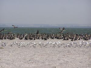 Great cormorants and seagulls on the Belosaraysk Spit.