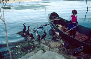 The lake is an important food source for the local people (Bais), who are famous for their fishing method: their trained cormorants catch fish and return them to fishmongers. The birds are prevented from swallowing their fish by rings fixed around their neck.