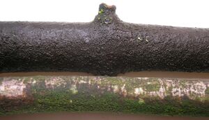 The angels' share fungus, Baudoinia compniacensis on bark, top, with an unaffected sample below