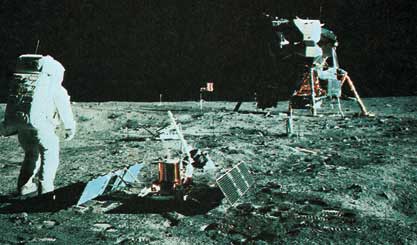 أول الناس على القمر. كان رائدا الفضاء الأمريكيان، نيل أرمسترونج الذي التقط هذه الصورة، وإدوين ألدرن يوجين الابن، في الأعلى، بالقرب من مقياس الزلازل، هما أول من نزل على سطح القمر.