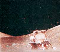المركبة القمرية تنطلق من القمر في هذه الصورة المأخوذة من بث تلفازي. بعد الانطلاق، ذهبت المركبة القمرية إلى مدار حول القمر كان منخفضًا عن مدار مركبة القيادة. وعندما أصبحت المركبتان الفضائيتان في المكانين الصحيحين، دخلت المركبة القمرية في مدار مركبة القيادة نفسه، وبعدئذ التحمت مركبة القيادة مع المركبة القمرية.