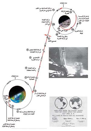 من الأرض إلى القمر. تبين الصورة الإيضاحية على هذه الصفحة العمليات الجارية في إرسال مركبة فضائية إلى القمر. بعد أن تهبط المركبة القمرية (16)، ينجز الرواد مهماتهم العلمية على القمر.كي تغادر المركبة القمرية أرض القمر، فإنها ترتفع إلى أعلى وتلتحم مع مركبة القيادة. وبعد عملية الالتحام ينتقل طاقم المركبة القمرية إلى مركبة القيادة وبعدئذ تُفصل المركبة القمرية وتعود مركبة القيادة إلى الأرض
