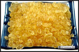تعتبر هذه المادة من المواد الصمغية التي تستخرج من جذوع الأشجار وتختلف جودتها بحسب نوع الجذع ومكان زراعته و هي عبارة عن فصوص راتنجية معروفة من قديم، رغم أن الراتنج يبرز تلقائياً فإن الإفراز يزداد إذا ما أزيلت شرائح من اللحاء أو بعمل شقوق طويلة في جذع الشجرة والأغصان الكبيرة للنبات فتسيل عصارته الراتنجية سائلة تجمد بسرعة وتبقى متعلقة بالشجرة على هيئة دموع هشة بيضاوية أو حبوب طويلة لونها أصفر في حين يتساقط الباقي على الأرض.