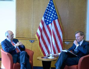 روبرت زيوليك، نائب وزير الخارجية الأمريكي (يمين) برفقة يان پرونك المندوب الخاص للأمم المتحدة في السودان أثناء مؤتمر المتبرعون للسودان الذي عُقد في أوسلو، 12 أبريل 2005.
