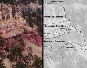 The final layers of the Black Hills consist of sedimentary rocks. The oldest lie on top of the metamorphic layers at a much shallower angle. This rock called the Deadwood Formation is mostly sandstone and was the source of gold found in the Deadwood area. Above the Deadwood Formation lies the Englewood Formation and Pahasapa limestone, which is the source of the more than 200 caves found in the Black Hills, including Jewel Cave and Wind Cave. The Minnelusa Formation is next and is composed of highly variable sandstones and limestones followed by the Opeche shale and the Minnekahta limestone.