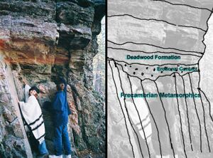 Making a concentric ring around the core is the metamorphic zone. The rocks in this ring are all very old, as much as 2 billion years and older. This zone is very complex, filled with many diverse rock types. The rocks were originally sedimentary until there was a collision between the North American continent and a terrane. This collision, called the Trans-Hudson Orogeny, caused the original rocks to fold and twist into a vast mountain range. Over millions of years, these tilted rocks, which in many areas are tilted to 90 degrees or more, eroded. Today we see the evidence of this erosion in the Black Hills, where the metamorphic rocks end in an angular unconformity below the younger sedimentary layers.