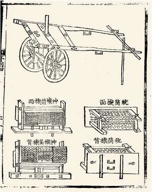 An "eruptor" as depicted in the Huolongjing. Essentially a fire lance on a frame, the 'multiple bullets magazine eruptor' shoots lead shots, which are loaded in a magazine and fed into the barrel when turned around on its axis.