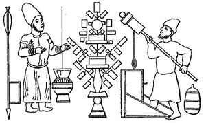 Description of the drug (mixture) to be introduced in the madfa'a (cannon) with its proportions: barud, ten; charcoal two drachmes, sulphur one and a half drachmes. Reduce the whole into a thin powder and fill with it one third of the madfa'a. Do not put more because it might explode. This is why you should go to the turner and ask him to make a wooden madfa'a whose size must be in proportion with its muzzle. Introduce the mixture (drug) strongly; add the bunduk (balls) or the arrow and put fire to the priming. The madfa'a length must be in proportion with the hole. If the madfa'a was deeper than the muzzle's width, this would be a defect. Take care of the gunners. Be careful[116]