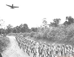 مجموعة من جنود الجيش الثوري الوطني، من الجيش الأول الجديد بقيادة سون لي-جن، يسيرون بينما طائرة تحلق فوقهم أثناء حملة بورما.