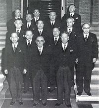 Ishibashi's cabinet (Ishibashi is in the centre, with Nobusuke Kishi to his left, as his Minister for Foreign Affairs, and Hayato Ikeda to his right as his وزير المالية).