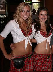 Waitresses of Tilted Kilt Pub & Eatery restaurant in uniform. Tilted Kilt has skimpily dressed waitresses, and is thus an example of a breastaurant.