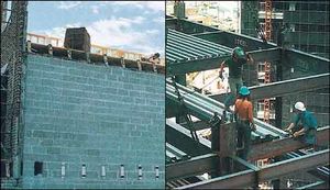 بعد الانتهاء من الحفر، يتم بناء القواعد والبناء العلوي. ويكون معظم الفولاذ المستخدم في البناء العلوي، مثل العتبات، والعوارض، والأعمدة، من النوع السابق الإعداد. وتحمل كل قطعة فولاذية رقماً يوضح الموقع المحدد الذي يجب أن توضع فيه. وعند رفع الفولاذ إلى موقعه، يربط العمال القطع الفولاذية بالبراغي ـ مؤقتاً ـ وبعد ذلك، يربط اللحامون هذه القطع بشكل نهائي.