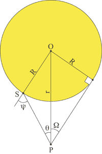 In the figure on the right, as long as the observer at point P is outside the stellar atmosphere, the intensity seen in the direction θ will be a function only of the angle of incidence ψ. This is most conveniently approximated as a polynomial in cos(ψ)