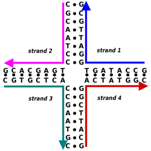 The complexes constructed in structural DNA nanotechnology use topologically branched nucleic acid structures containing junctions. (In contrast, most biological DNA exists as an unbranched double helix.) One of the simplest branched structures is a four-arm junction that consists of four individual DNA strands, portions of which are complementary in a specific pattern. Unlike in natural Holliday junctions, each arm in the artificial immobile four-arm junction has a different base sequence, causing the junction point to be fixed at a certain position. Multiple junctions can be combined in the same complex, such as in the widely used double-crossover (DX) structural motif, which contains two parallel double helical domains with individual strands crossing between the domains at two crossover points. Each crossover point is, topologically, a four-arm junction, but is constrained to one orientation, in contrast to the flexible single four-arm junction, providing a rigidity that makes the DX motif suitable as a structural building block for larger DNA complexes.[3][6]