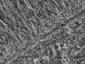 Because extracellular[13] iron is strongly involved in inducing calcification,[14][15] its control is essential in developing shells; the protein ferritin plays an important role in controlling the distribution of iron.[16] The most common mineral present in biomineralization is hydroxyapatite (HA), which is a naturally occurring mineral form of calcium apatite with the formula Ca10(PO4)6(OH)2. Hydroxyapatite crystals are found in many biological materials including bones,[17] fish scales,[18] and cartilage.[19] Each material has a mineral content which corresponds with the required mechanical properties, where increasing HA content typically leads to increased stiffness but reduced extensibility.[20]