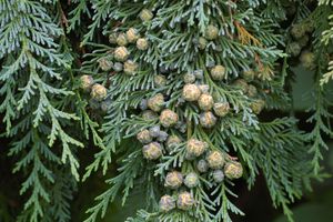 | Lawson's Cypress foliage with cones: immature seed cones below, pollen cones above | |
