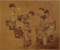 Surprisingly, actors on stage did not have a wholesale monopoly on theatrical entertainment, as even vendors and peddlers in the street, singing lewd songs and beating on whatever they could find to compensate for percussion instruments, could draw crowds.[43] This practice was so widespread that West claims "the city itself was turned into a stage and the citizens into the essential audience."[44] Many of the songs played for stage performances were tunes that originated from vendors' and peddlers' songs.[45] Contests were held on New Year's Day to determine which vendor or peddler had the best chants and songs while selling wares; the winners were brought before the imperial court to perform.[44] The Wulin jiushi of the Southern Song states that these vendors, when presented to the consorts and concubines of the palace, were lavished with heaps of gold and pearls for their wares; some vendors would "become rich in a single evening."[37] Theatrical stunts were also performed to gain attention, such as fried-glutinous-rice-ball vendors hanging small red lamps on portable bamboo racks who would twirl them around to the beat of a drum to dazzle crowds.[46] Puppet shows in the streets and wards were also popular.[37]