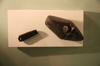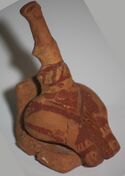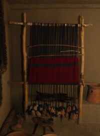 No examples of Cucuteni–Trypillia textiles have yet been found – preservation of prehistoric textiles is rare and the region does not have a suitable climate. However, impressions of textiles are found on pottery sherds (because the clay was placed there before it was fired). These show that woven fabrics were common in Cucuteni–Trypillia society.[70][71] Finds of ceramic weights with drilled holes suggest that these were manufactured with a warp-weighted loom.[72] It has also been suggested that these weights, especially "disposable" examples made from poor quality clay and inadequately fired, were used to weigh down fishing nets. These would probably have been frequently lost, explaining their inferior quality.[73]