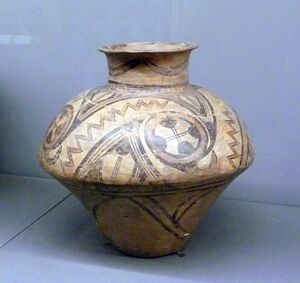Characteristically, vessels were elaborately decorated with swirling patterns and intricate designs. Sometimes decorative incisions were added prior to firing, and sometimes these were filled with coloured dye to produce a dimensional effect. In the early period, the colours used to decorate pottery were limited to a rusty-red and white. Later, potters added additional colours to their products and experimented with more advanced ceramic techniques.[20] The pigments used to decorate ceramics were based on iron oxide for red hues, calcium carbonate, iron magnetite and manganese Jacobsite ores for black and calcium silicate for white. The black pigment, which was introduced during the later period of the culture, was a rare commodity: taken from a few sources and circulated (to a limited degree) throughout the region. The probable sources of these pigments were Iacobeni in Romania for the iron magnetite ore and Nikopol in Ukraine for the manganese Jacobsite ore.[66][67] No traces of the iron magnetite pigment mined in the easternmost limit of the Cucuteni–Trypillia region have been found to be used in ceramics from the western settlements, suggesting exchange throughout the entire cultural area was limited. In addition to mineral sources, pigments derived from organic materials (including bone and wood) were used to create various colours.[68]