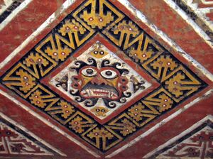The Moche may have also held and tortured the victims for several weeks before sacrificing them, with the intent of deliberately drawing blood. Verano believes that some parts of the victim may have been eaten as well in ritual cannibalism.[25] The sacrifices may have been associated with rites of ancestral renewal and agricultural fertility. Moche iconography features a figure which scholars have nicknamed the "Decapitator"; it is frequently depicted as a spider, but sometimes as a winged creature or a sea monster: together all three features symbolize land, water and air. When the body is included, the figure is usually shown with one arm holding a knife and another holding a severed head by the hair; it has also been depicted as "a human figure with a tiger's mouth and snarling fangs".[26] The "Decapitator" is thought to have figured prominently in the beliefs surrounding the practice of sacrifice.