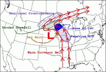 Preferred region of heavy snowfall ("Banded Snowfall") around the comma head of a wintertime low pressure area, shaded in green in the الولايات المتحدة.
