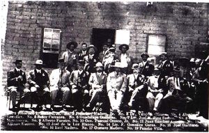 Leaders of the 1910 revolt pose for a photo after the First Battle of Juárez. Present are José María Pino Suárez, Venustiano Carranza, Francisco I. Madero (and his father), Pascual Orozco, Pancho Villa, Gustavo Madero, Raul Madero, Abraham González, and Giuseppe Garibaldi Jr.