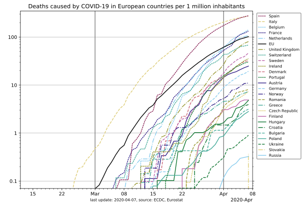 الأعداد التراكمية للوفيات لكل مليون نسمة جراء الإصابة بكوڤيد-19 في أوروپا.[1] | |