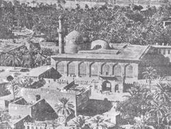 "وبأعلى الشرقية خارج البلدة محلة كبيرة بإزاء محلة الرصافة كان باب الطاق المشهور على الشط وفي تلك المحلة مشهد حفيل البنيان له قبة بيضاء سامية في الهواء فيه قبر الإمام أبي حنيفة وبه تعرف المحلة."