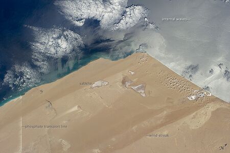 الساحل الصحراوي للمغرب والصحراء الغربية، 2014. "الشمال" في الزاوية اليمنى العليا من الصورة. لاحظ الخطوط المستقيمة الناتجة عن الرياح الشمالية القوية التي تهب موازية للساحل، وتنتج خطوطًا للرياح من الرمال والأسطح الخالية من الرمال. لاحظ أيضًا ممر النقل للطرق والسكك الحديدية ونظام حزام النقل (الخط العمودي على اليسار) الذي ينقل الفوسفات 100 كيلومتر (62 mi) من المناجم الداخلية إلى الساحل. رياح شمالية قوية تهب الغبار والفوسفات في الصحراء ، مما يعطي حافة خشنة لهذا الخط على جانبه الجنوبي.[1]