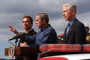 Governor-elect Arnold Schwarzenegger (left) and Governor Gray Davis (right) with President George W. Bush in 2003