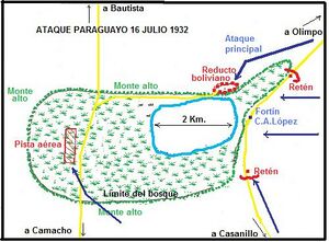 Fortín Boquerón was the first target of the Paraguayan offensive. The Boquerón compound was guarded by 619 Bolivian troops and resisted a 22-day siege by a 5,000-man Paraguayan force. An additional 2,500 Bolivians attempted to relieve the siege from the southwest but were beaten back by 2,200 Paraguayans, who defended the accesses to the siege area. A few Bolivian units managed to enter Fortín Boquerón with supplies, and the Bolivian Air Force dropped food and ammunition to the besieged soldiers. Having begun on 9 September, the siege ended when Fortín Boquerón finally fell on 29 September 1932.[66]
