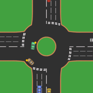 A diagram of movement within a roundabout in a country where traffic drives on the left. A roundabout is a type of road junction, or traffic calming device, at which traffic streams circularly around a central island after first yielding to the circulating traffic. Unlike with traffic circles, vehicles on a roundabout have priority over the entering vehicle, parking is not allowed and pedestrians are usually prohibited from the central island.