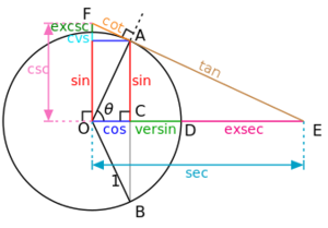 ظل الزاوية = جيب الزاوية/ جيب تمام الزاوية ظل تمام الزاوية = جيب تمام الزاوية / جيب الزاوية قا (قاطع) = 1 / جتا يه قاطع تمام (قتا) = 1 / جيب بهذا نكون قد عرفنا التوابع المثلثية للزوايا من 0 إلى 90، من الممكن توسيع تعريفنا ليشمل كل القيم الحقيقية للزوايا باستخدام الدائرة الواحدية.