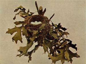 تتولّى الأنثى مُهمَّة بناء العش، فتنتقي موقعًا مُلائمًا في شجرةٍ أو جنبةٍ نفضيَّة على ارتفاعٍ يُقارب 10 أمتار (33 قدمًا). يستمرُّ بناء العُش حوالي ستة أيام، تعملُ الأنثى خلالها مابين 10 و40 دقيقة مُتزايدة. غالبًا ما يُرى الذكر وهو يَطيرُ إلى جانب الأنثى أثناء تجميعها مواد البناء، وقد يُشاركها عبء حمل بعضها، لكنه يترك مُهمَّة إنشاء العش نفسه إليها. تُصنعُ القشرة الخارجيَّة للعش من لحاء الأشجار، والطحالب، وحبال الكروم، والأعشاب.[21] يصل قطر العش الداخليّ بعد انتهائه إلى حوالي 6.5 سنتيمترات (2.6 إنشات).[20] تُدعَّمُ الحافَّة باللحاء المُقيَّد بشباك العنكبوت وحرير اليساريع، ويُبطّنُ الداخل بورق الصقلاب، أو الشوك البريّ، أو البوط. تُحاك مواد بناء العُش بشكل متينٍ للغاية لدرجة أنها تحبسُ الماء، وقد تنفقُ الفراخ غرقًا في عاصفةٍ رعديَّة بحال لم يَقم الوالدان بتغطية العُش.[15]