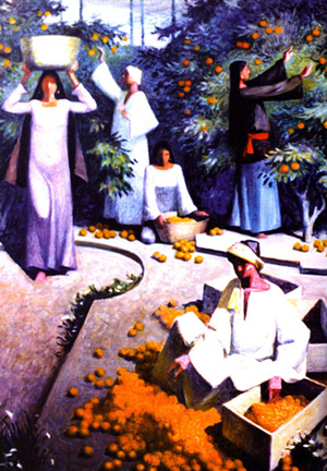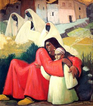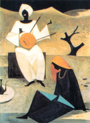 وقد أحب ` بيكار ` مثالنا العظيم محمود مختار فكانت نساؤهما متشابهة الرقة والاتساق والشموع والجمال .. وفى هذه اللوحات كانت الخضرة يانعة الشكل والأفرع حانية والجرار كما القلوب الطيبة والناس كالجمال بقدمين أما الأرض فهى بساط أو سجادة صلاة الكل فوقها خاشع القلب بملامحهم وحركاتهم طقوسا شعورية مقدسة .. إنه عالم طاهر تمناه بيكار لنا فمنحه لنا لوحاته حلما رقيقا.
