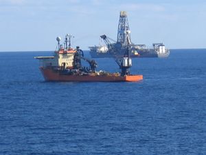 الحفار ديسكڤرر إنترپرايز، في الخلفية وهو يعمل أثناء المرحلة الاستكشافية في حقل بحري جديد. تظهر في المقدمة مركبة الدعم البحرية "تويسا پرسويس" (Toisa Perseus).