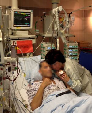 A person receiving a medication through an intravenous line (cannula) | |