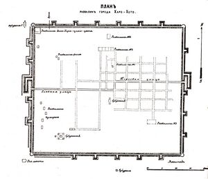 Khara-Khoto is known by many names, including الصينية: 黑城 Hēichéng "black castle(city)", Tangut: 𗋽𗰞 /*zjɨ̱r²-nja̱¹/ "black water"[2] (transcribed into Chinese as 亦集乃 Yijinai), Modern Mongolian Khar khot (Middle Mongol language:ᠬᠠᠷᠠ