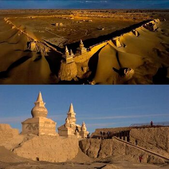 The defeat of the Mongols at Khara-Khoto is described in the Ming dynasty annals: "In the fifth year of Hungu (1372), General Feng Sheng and his army reached Edzina. The town's defender Buyan'temur surrendered, and Chinese troops reached the mountains of Bojiashan. The ruler of Yuan, Gyardzhipan', fled. His minister... and 27 others were captured, together with ten or more thousand head of horses and cattle."[7] After the defeat, and also possibly due to a water shortage,[5] the city was abandoned and left in ruins. Its exceedingly remote location preserved it from looters.