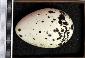 The nest is a shallow scrape in the sand on open, flat or occasionally sloping ground. It is often unlined, but sometimes includes stones or cuttlefish bones. One, sometimes two, eggs are laid and incubated by both parents for 25 to 30 days prior to hatching.[14] The eggs are cream with blackish streaks.[29] Egg laying is synchronised within a breeding colony[30] and more tightly so within sub-colonies.[31] Parents do not recognize their own eggs or newly hatched chicks, but are able to distinguish their chicks by the time they are two days-old, shortly before they begin to wander from the nest.[32] The precocial chicks, which are very pale with black speckling, are brooded and fed by both parents, but may gather in crèches when older. The young terns fledge after 38 to 40 days, but remain dependent on the parents after leaving the colony until they are about four months old.[14]