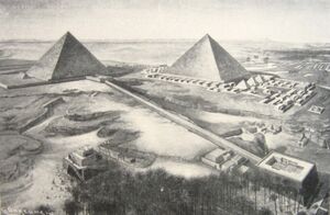 Drawing of Khafre's pyramid complex. A causeway connected the Valley Temple (bottom-right) to the Pyramid Temple (top-left). Photo taken in 1910.