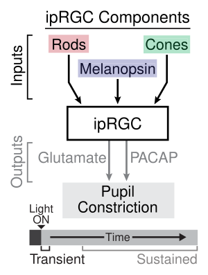 باستخدام العديد من المستقبلات الضوئية للفئران ، حدد الباحثون دور الخلايا العقدية الشبكية الحساسة للضوء في كل من الإشارات العابرة والمستمرة لمنعكس حدقة العين (PLR)).[15] حدث منعكس حدقة العين العابر في شدة الضوء الخافتة إلى المعتدلة وهو نتيجة التنبيغ الضوئي الذي يحدث في الخلايا العصوية ، والتي توفر مدخلات متشابكة على الخلايا العقدية الشبكية الحساسة للضوء ، والتي بدورها تنقل المعلومات إلى النواة أمام السقفية الزيتونية في الدماغ المتوسط.[16] الناقل العصبي المشترك في ترحيل المعلومات إلى الدماغ المتوسط من الخلايا العقدية الشبكية الحساسة للضوء في منعكس حدقة العين العابر هو الغلوتامات . في شدة الضوء الأكثر إنارةً ، يحدث منعكس حدقة العين المستمر ، والذي يتضمن كلاً من النقل الضوئي للعصوي الذي يوفر مدخلات لللخلايا العقدية الشبكية الحساسة للضوء ونقل ضوئي اللخلايا العقدية الشبكية الحساسة للضوء نفسها عبر الميلانوبسين. اقترح الباحثون أن دور الميلانوبسين في منعكس حدقة العين المستمر يرجع إلى افتقاره للتكيف مع المنبهات الضوئية على عكس الخلايا العصوية ، التي تظهر التكيف. يتم الحفاظ على منعكس حدقة العين متواصل من ببتيد منشط محلقة الأدينيلات النخامية الإفراج عن الخلايا العقدية الشبكية الحساسة للضوء بطريقة نابضة.[15]
