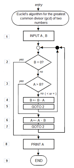 Flow chart of an algorithm (Euclid's algorithm) for calculating the greatest common divisor (g.c.d.) of two numbers a and b in locations named A and B. The algorithm proceeds by successive subtractions in two loops: IF the test B ≥ A yields "yes" (or true) (more accurately the number b in location B is less than or equal to the number a in location A) THEN the algorithm specifies B ← B − A (meaning the number ba replaces the old b). Similarly IF A > B THEN A ← A − B. The process terminates when (the contents of) B is 0, yielding the g.c.d. in A. (Algorithm derived from Scott 2009:13; symbols and drawing style from Tausworthe 1977).