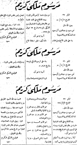 - مادة ٥٣ – جميع الصلاحيات المنوطة بالملك في هذا النظام الأساسى، أو في غيره من الأنظمة، يتولاها بواسطة مجلس الوزراء، بمراسم يوقعها إلى جانب توقيع الملك، رئيس مجلس الوزراء والوزراء المختصون، على أن تعيين رئيس مجلس الوزراء وقبول استقالته وإعفاءه يكون بأمر ملكى.