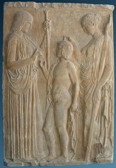 The Eleusinian trio: Persephone, Triptolemus and Demeter (Roman copy dating to the Early Imperial period and hosted by the Metropolitan Museum of Art, of the Great Eleusinian Relief in the National Archaeological Museum, Athens, marble bas-relief from Eleusis, 440–430 BC.)