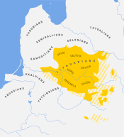 The first mention of the name Lithuania is found in the Annals of Quedlinburg, which describes the missionary expedition of Bruno of Querfurt to Yotvingians.[40] In the 12th century, Slavic chronicles refer to Lithuania as one of the areas attacked by the Rus'. Pagan Lithuanians initially paid tribute to Polotsk, but they soon grew in strength and organized their own small-scale raids. At some point between 1180 and 1183 the situation began to change, and the Lithuanians started to organize sustainable military raids on the Slavic provinces, raiding the Principality of Polotsk as well as Pskov, and even threatening Novgorod.[41] The sudden spark of military raids marked consolidation of the Lithuanian lands in Aukštaitija.[5] The Lithuanians are the only branch within the Baltic group that managed to create a state entity in premodern times.[42]