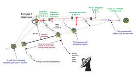 - ستأخذ المركبة الفضائية ديب امباكت (أو الضربة العميقة) التي سينطلق منها المسبار صورا وستجمع بيانات عن الاصطدام ومرحلة ما بعد الاصطدام على بعد 133 مليون كم عن الأرض. مهمة ديب إمباكت التي تكلفت 333 مليون دولار ستتيح فرصة لفحص ما هو تحت قشرة سطح المذنب ، حيث توجد مواد باقية منذ تكونت المجموعة الشمسية قبل 4.5 بليون سنة، ويعتقد أنها ما زالت كما هي بدون أي تغيير نسبياً.خطأ استشهاد: وسم